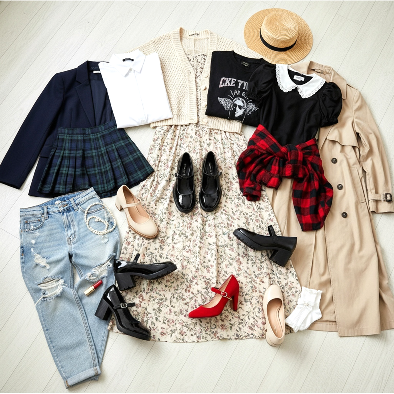 Preppy tyyli – musta patentoitu Mary Jane tasaisella pohjalla, laskostettu ruudullinen hame, valkoinen paita ja V-kaula-aukkoinen pusero. Koristele hiusnauhalla ja helmikoruilla. Klassikko suoraan amerikkalaisista korkeakouluista.