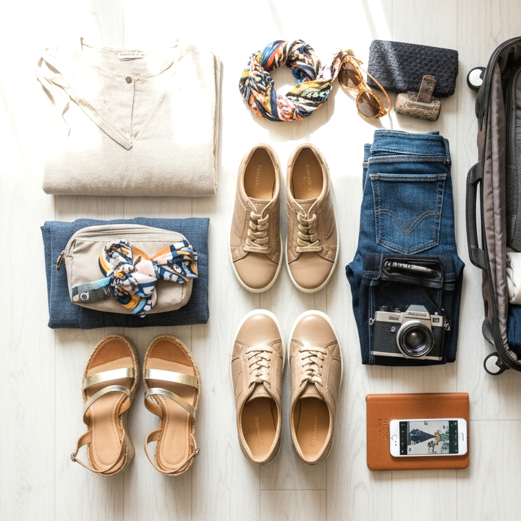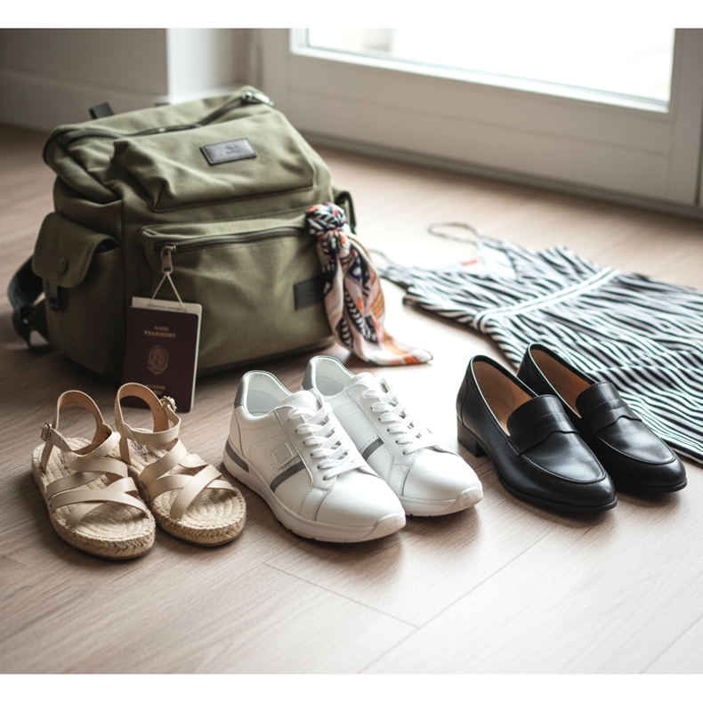 Jokaiselle matkalle todistettu kaava on kolmen parin sääntö: mukavat kengät nähtävyyksiin tutustumiseen, tyylikkäät ulkoilukengät ja ranta- tai urheilukengät matkan luonteesta riippuen. Tämä yhdistelmä kattaa käytännöllisesti katsoen kaikki tilanteet aamulenkistä iltaillalliseen.