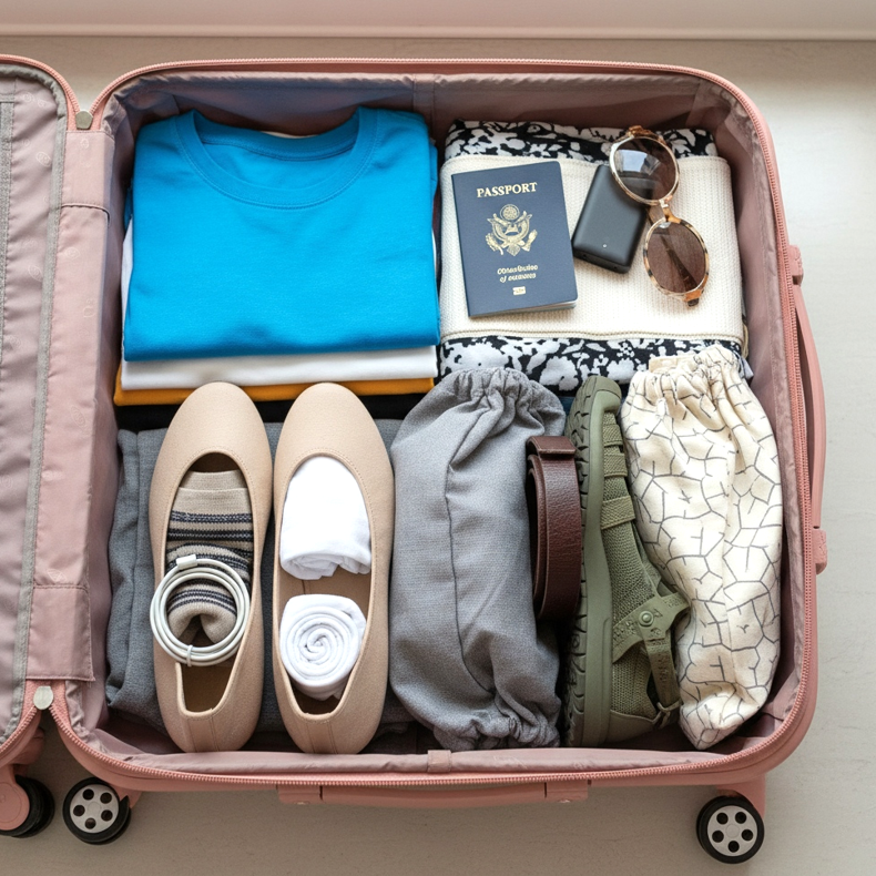 Käytä kenkien sisäpuolta pieniin esineisiin: sukkiin, alusvaatteisiin, latureihin tai vyöön. Tämä on klassinen temppu, joka säästää yllättävän paljon tilaa. Aseta kengät matkalaukun pohjalle, pohjat seinää vasten – ne luovat vakaan pohjan muille vaatteillesi eivätkä likaa vaatekaappiasi.