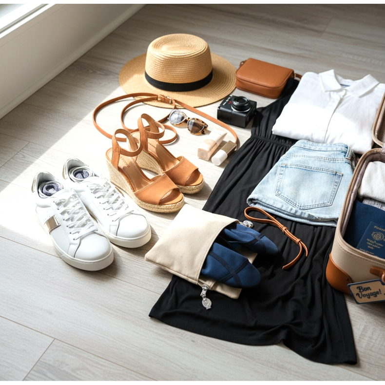 Litteät sandaalit + varvastossut tai vesikengät + kevyet tennarit. Sandaalit sopivat täydellisesti iltakävelylle kävelykadulle, varvastossut ovat hyödyllisiä rannalla ja tennarit pidemmille matkoille.
