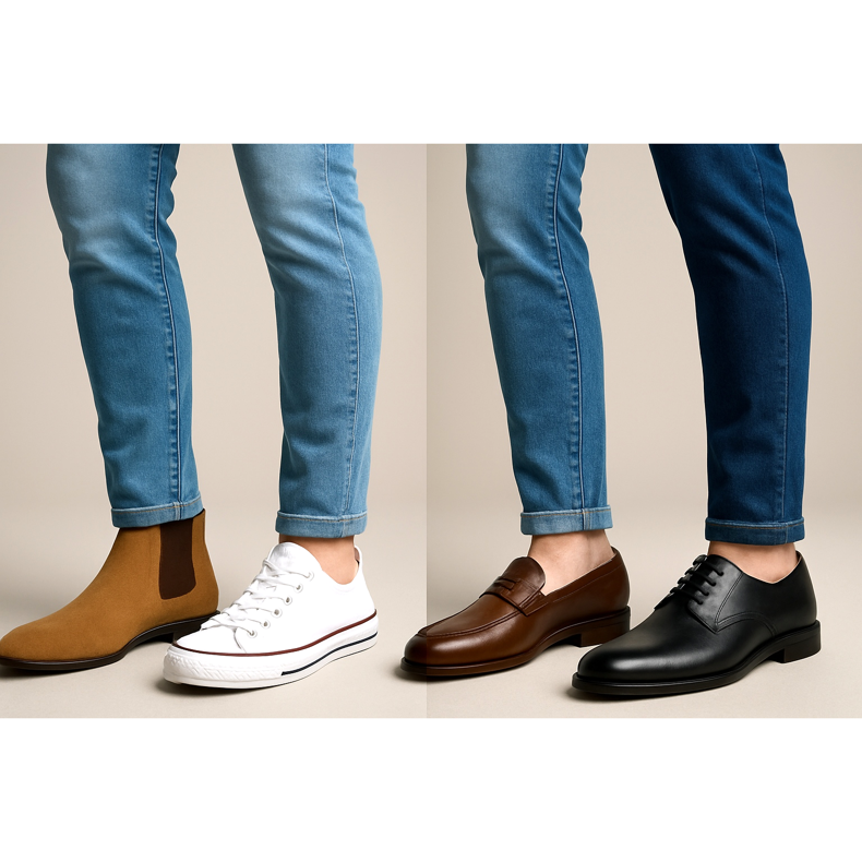 Miesten kengät farkuilla - kuinka valita kengät erilaisiin farkkuleikkauksiin
