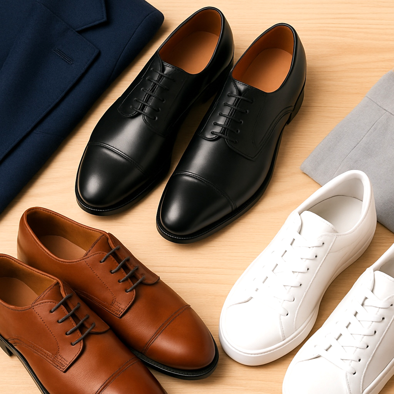 Black Oxfords kattaa useimmat muodolliset tilanteet. Lisää ruskea Derby ja valkoiset lenkkarit, niin olet valmis 95 %:iin tapauksista.