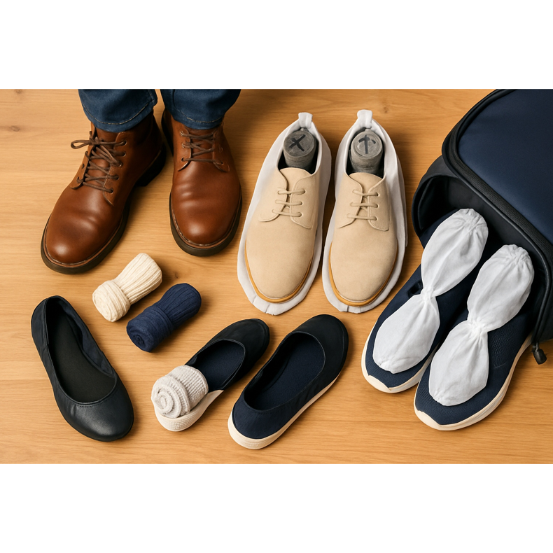 - Pari 2: Varapari (kevyt slip-on, sandaalit, loaferit) - pakattuna matkatavaroihin