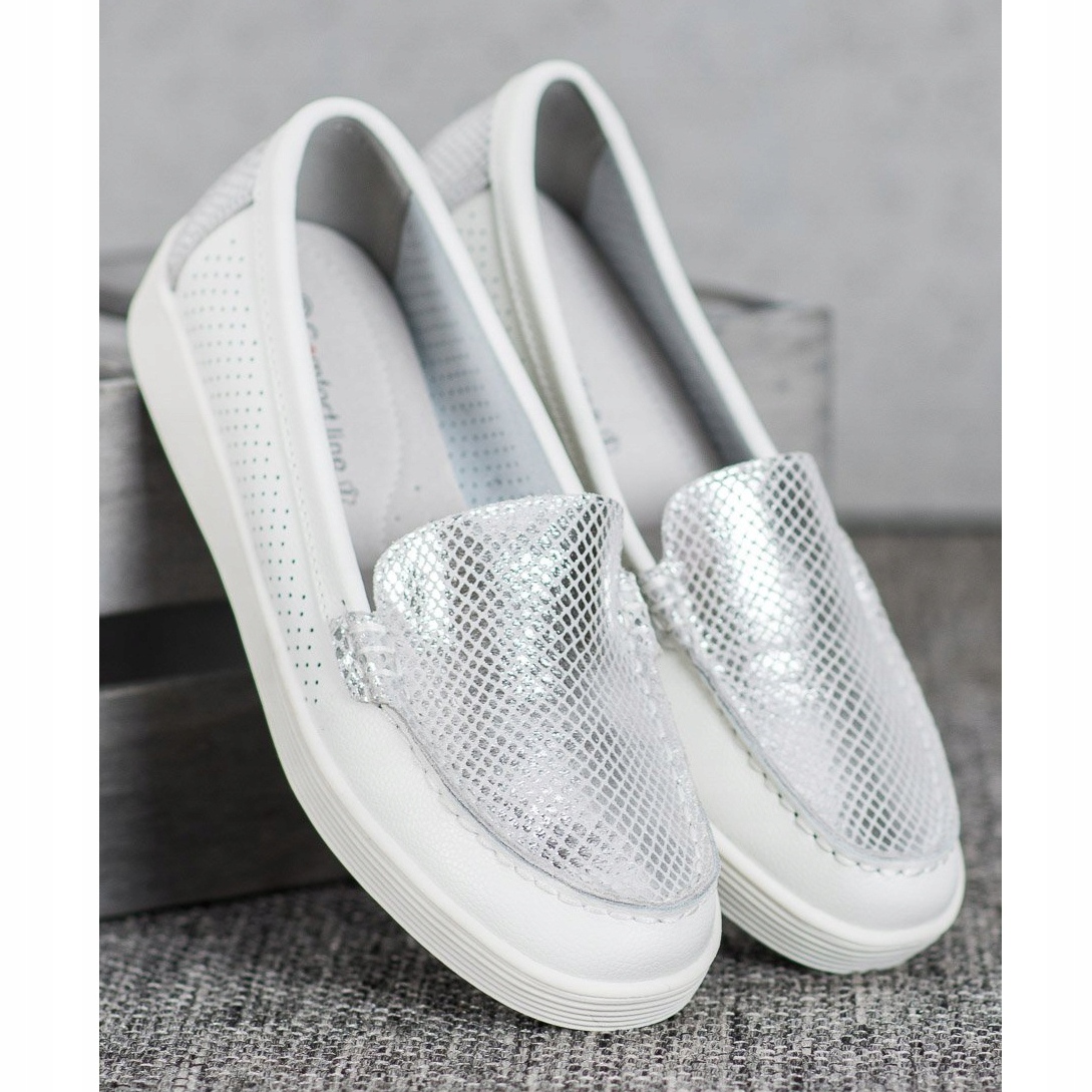 VINCEZA-alustat valkoisena ja harmaana ovat täydellinen valinta eleganssia ja mukavuutta arvostaville naisille. Nämä klassiset, herkät kengät on valmistettu korkealaatuisesta luonnonnahasta, mikä takaa kestävyyden ja tyylikkään ulkonäön. Mielenkiintoinen aksentti on kengän yläosassa oleva hopeinen yksityiskohta, joka antaa kengän modernin luonteen.