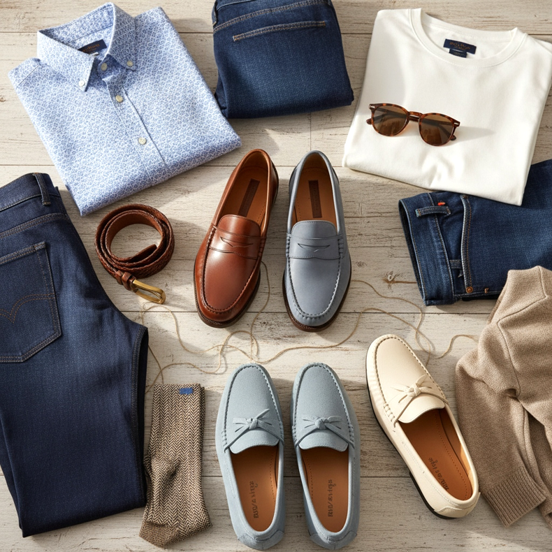 Smart casual on mokasiinien luonnollinen elinympäristö. Yhdistä chinot, herkästi kuvioitu paita ja nahkaiset loaferit ja saat tyylikkään mutta vaivattoman ilmeen. Voit lisätä takin tai neuletakin säästä ja tilaisuudesta riippuen. Tämä asu sopii erinomaisesti sosiaalisiin kokoontumisiin, illallisiin ravintolassa tai rennon perjantaihin toimistossa.