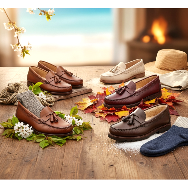 Vaikka mokasiinit yhdistetään pääasiassa kesään, ne sopivat oikealla valinnalla ympäri vuoden. Tärkeintä on mukauttaa malli ja tyyli sääolosuhteisiin.
