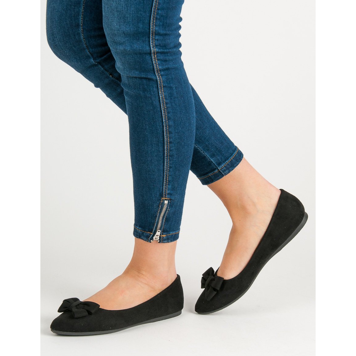 Ekologisesta mokkanahkasta valmistetut balerinakengät näyttävät erittäin vaikuttavilta, ja niiden musta väri tarkoittaa, että niitä voidaan yhdistää eri väreihin luoden ainutlaatuisia yhdistelmiä. Tyypilliset terävät varpaat lisäävät eleganssia, ja herkkä rusetti on muodikas aksentti, joka herättää varmasti huomion.
