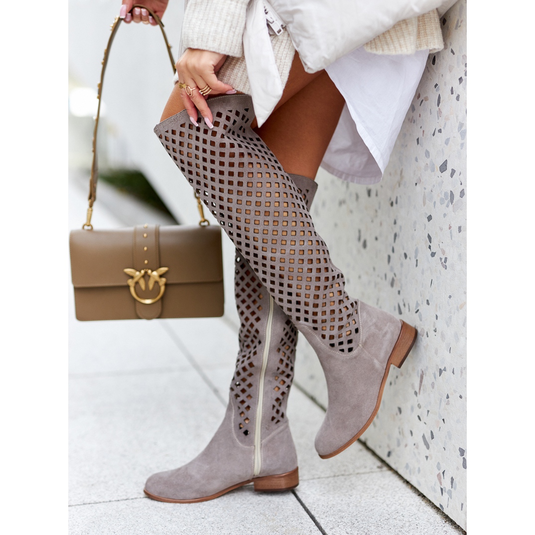 Saappaille on ominaista klassinen, polven yläpuolelle ulottuva leikkaus, jonka ansiosta ne näyttävät upeilta sekä mekkojen että housujen kanssa. Yläkorkeus on 41 cm ja yläleveys 18,5 cm, mikä varmistaa oikean istuvuuden jalkoihin. Lisäksi saappaissa on vain 3 cm korkea tasainen kantapää, joka takaa jokapäiväisen mukavuuden.