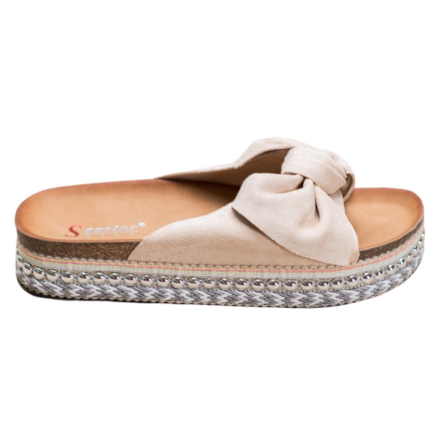 Kulutuspinnalla varustetun synteettisen pohjan ansiosta varvastossut tarjoavat riittävän pidon, mikä on korvaamatonta kesävaelluksissa. Lisäaksentit, kuten strassit ja rusetti, korostavat niiden ainutlaatuista tyyliä, ja ruskea ja beige värit sopivat täydellisesti kesätrendeihin.