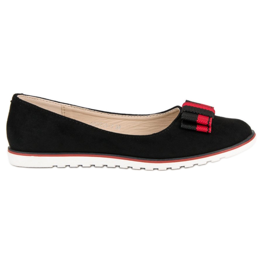 Balettiasunnoissa on universaali musta väri, joka sopii melkein mihin tahansa tyyliin. Koristeellisen punaisen ja mustan rusetin ja vaaleanpunaisen vivahteen ansiosta nämä kengät saavat naisellisuutta ja omaperäisyyttä. Pyöreät varpaat ja sisäänrakennettu pehmeä kantapää tarjoavat poikkeuksellista käyttömukavuutta, mikä tekee niistä täydellisen valinnan pitkiä päiviä liikkeellä.
