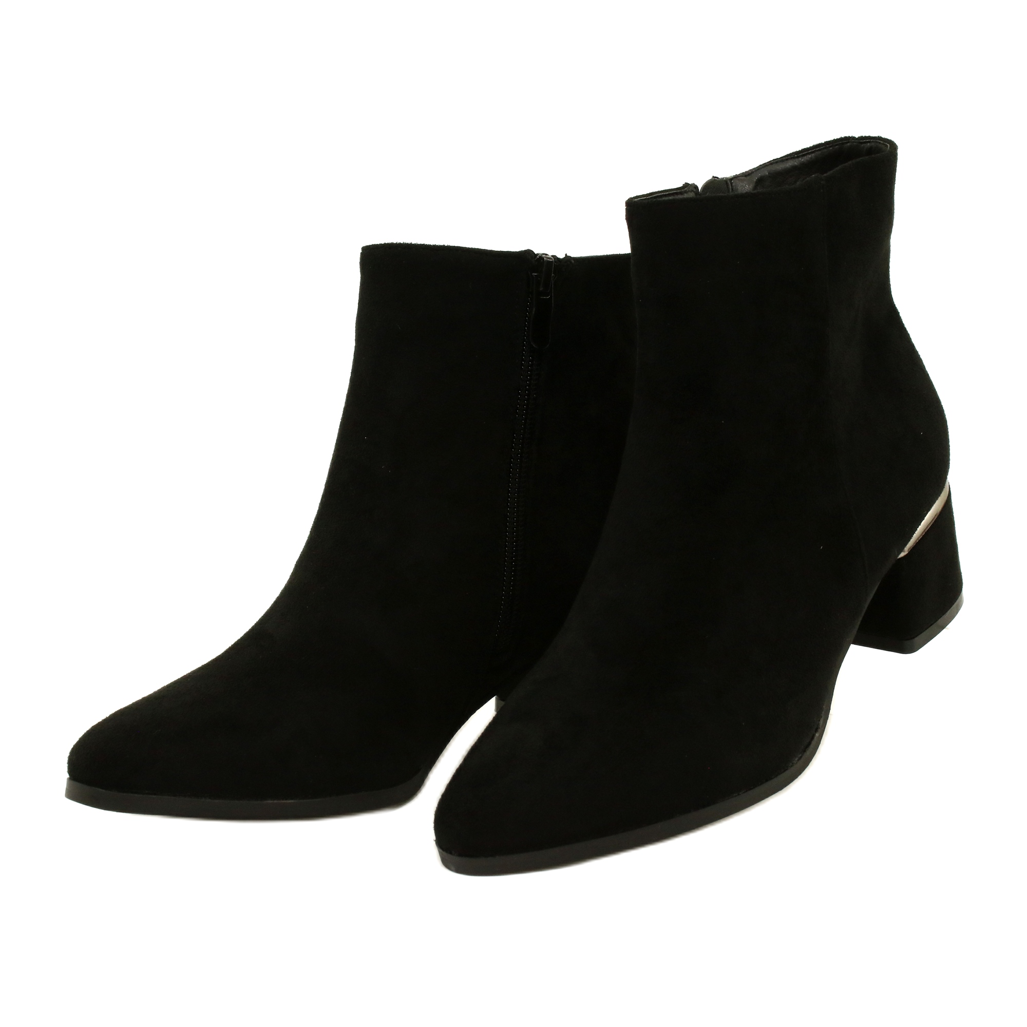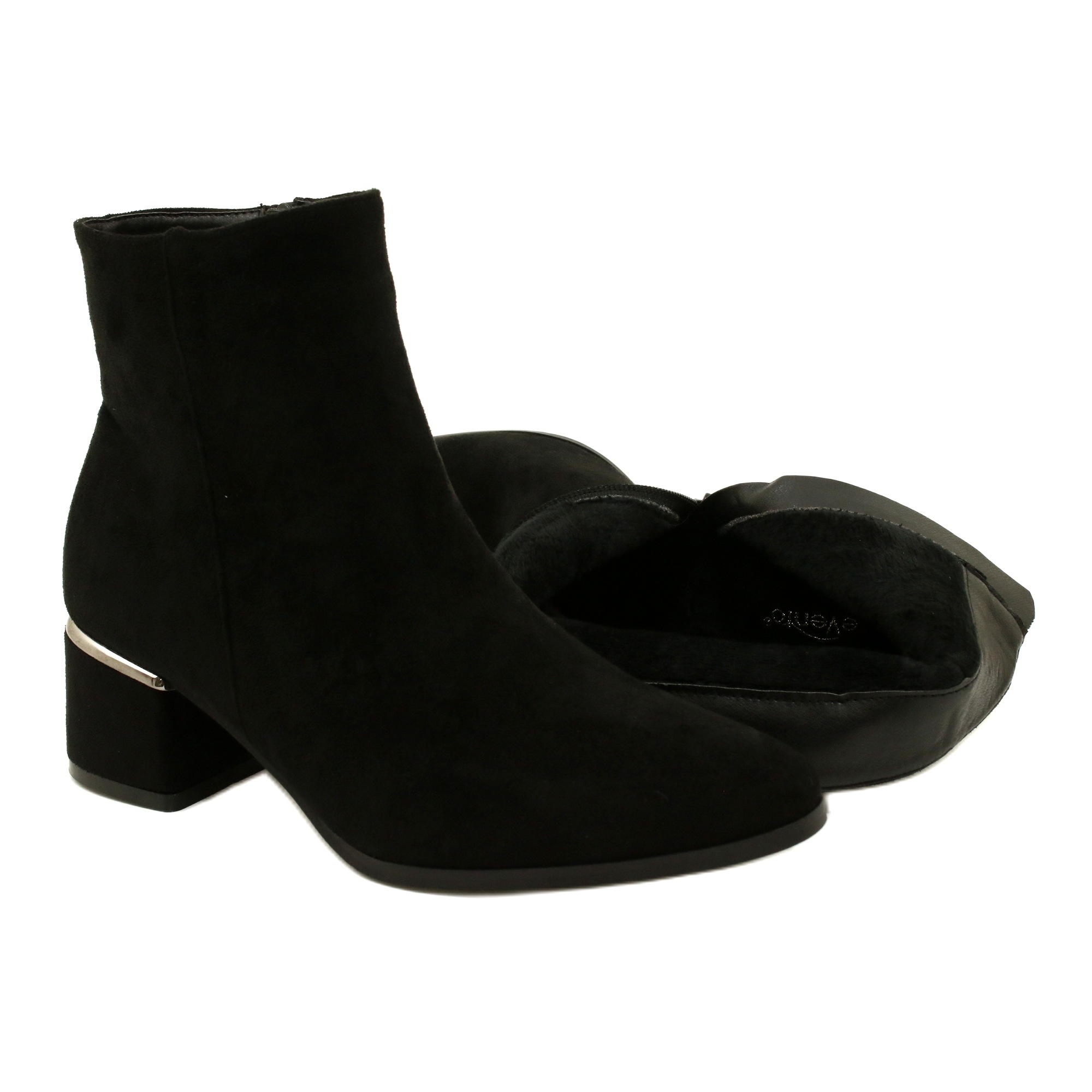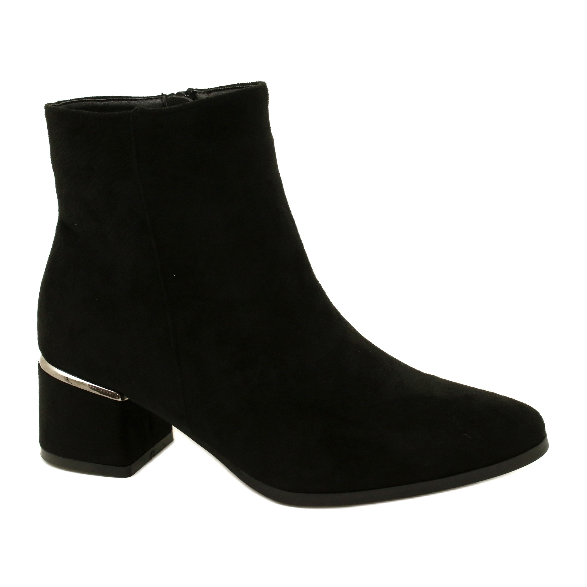 Klassiset ja tyylikkäät naisten Feetento -saappaat, jotka yhdistävät tyylin mukavuuteen. Valmistettu ekologisesta nahasta mokkanahka -tekstuurista universaalisella mustalla värillä, ne ovat täydellisiä sekä muodollisiin että päivittäisiin tyyliöihin. 5 cm: n korkea pylväs lisää naisellisuutta ja varmistaa samalla vakauden käytön. Vetoketjullinen malli helpottaa laittamista, ja näyttävä hopeakoriste korostaa hienovaraisesti kenkien luonnetta.