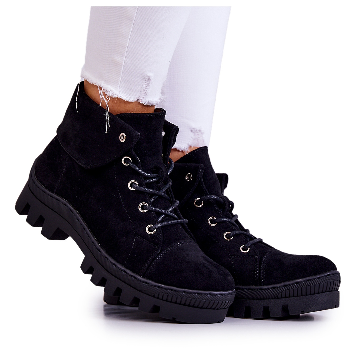 Saappaat on sidottu pyöreillä nauhoilla, mikä varmistaa täydellisen istuvuuden jalkaan. Paksulla pohjalla ja muodikkailla leikkauksilla, jotka lisäävät luonnetta, nämä saappaat takaavat paitsi tyylin myös vakauden. Kengän kärki on jäykistetty ja pyöristetty, mikä tekee siitä mukavan käyttää.