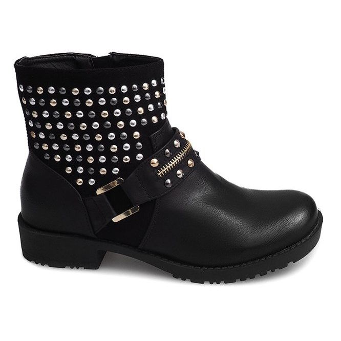 Mustat 1636-napilla varustetut moottorisaappaat ovat tyylikäs ja mukava valinta jokaiselle muotia ja mukavuutta arvostavalle naiselle. Nämä ainutlaatuiset kengät, hopeanväriset strassilla ja nastoilla koristeltu, tuovat hieman rock-tunnelmaa vaatekaappiisi. Vetoketjun ja soljen ansiosta saappaiden pukeminen ja riisuminen on erittäin helppoa.