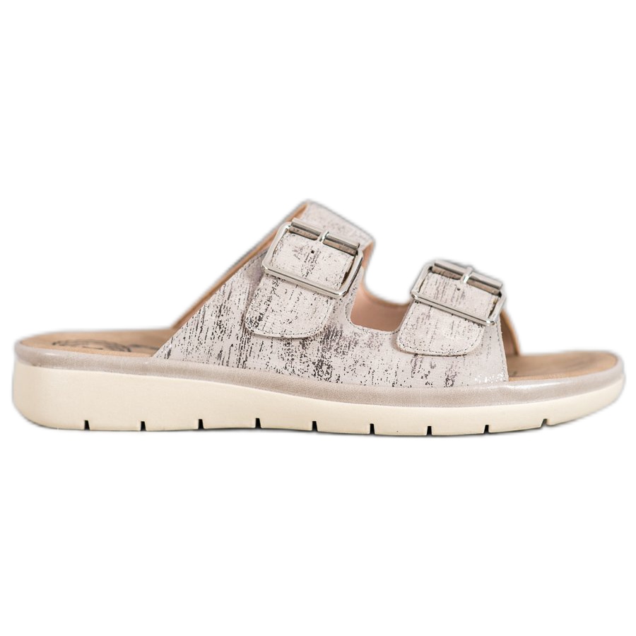 Varvastossut on valmistettu korkealaatuisesta beigen sävyisestä ekologisesta nahasta, koristeltu kulta- ja hopeaelementeillä, jotka lisäävät elegantin aksentin. Kaksi edessä sijaitsevaa koristesolkea eivät ole vain toiminnallinen yksityiskohta, vaan myös muodikas aksentti, joka vangitsee katseen.