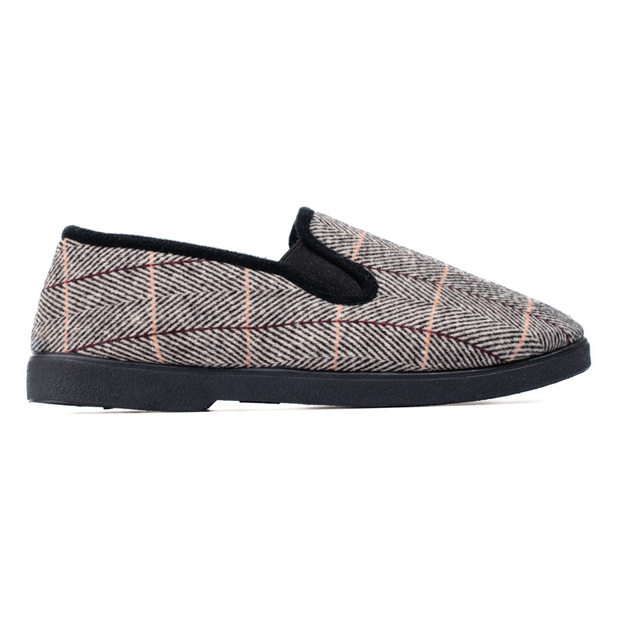 Eristettyjen miesten hyllytossut ajattomassa, harmaassa ruudullinen kuvio. Liukastui avoimella kantapäällä, joka on ihanteellinen päivittäiseen käyttöön kotona ympäri vuoden - erityisesti suositellaan viileämpinä päivinä lämpenemisen ansiosta.