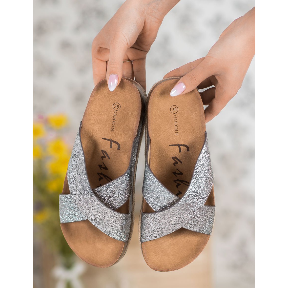 Löydä mukavuus ja eleganssi Goodinin hopeavarvastossujen avulla. Nämä tyylikkäät naisten varvastossut ovat täydellinen jokapäiväinen valinta, ja niissä yhdistyy klassinen muotoilu ja modernit aksentit. Valmistettu ekologisesta nahasta, ne takaavat käyttömukavuuden koko päivän, ja avoimen kantapäänsä ansiosta ne on helppo pukea päälle.