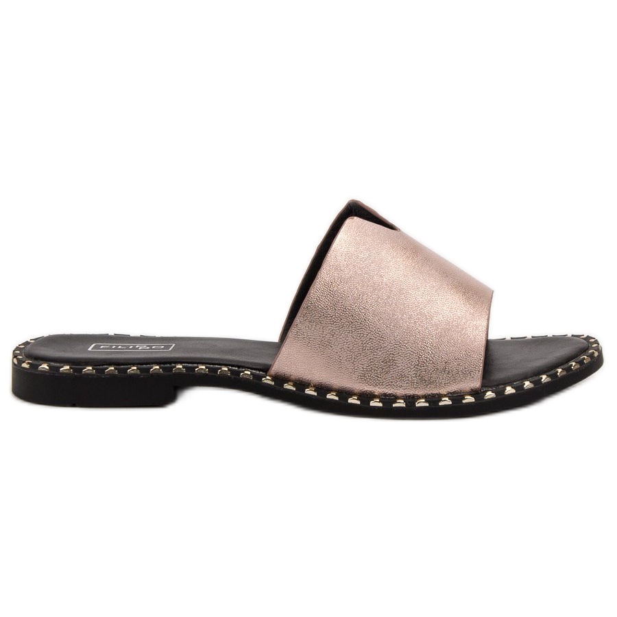 Filippo Comfortable Shiny Flip-Flops keltakultaiset varvastossut ovat täydellinen valinta naisille, jotka haluavat yhdistää tyylin mukavuuteen. Nämä tyylikkäät varvassandaalit, jotka on valmistettu ekologisesta nahasta, ilahduttavat satiinisella, kiiltävällä viimeistelyllään. Koristeellinen leikkaus edessä ja koristeelliset hopeiset suuttimet pohjassa antavat niille ainutlaatuisen luonteen, joten ne täydentävät täydellisesti kaikki kesätyylit.