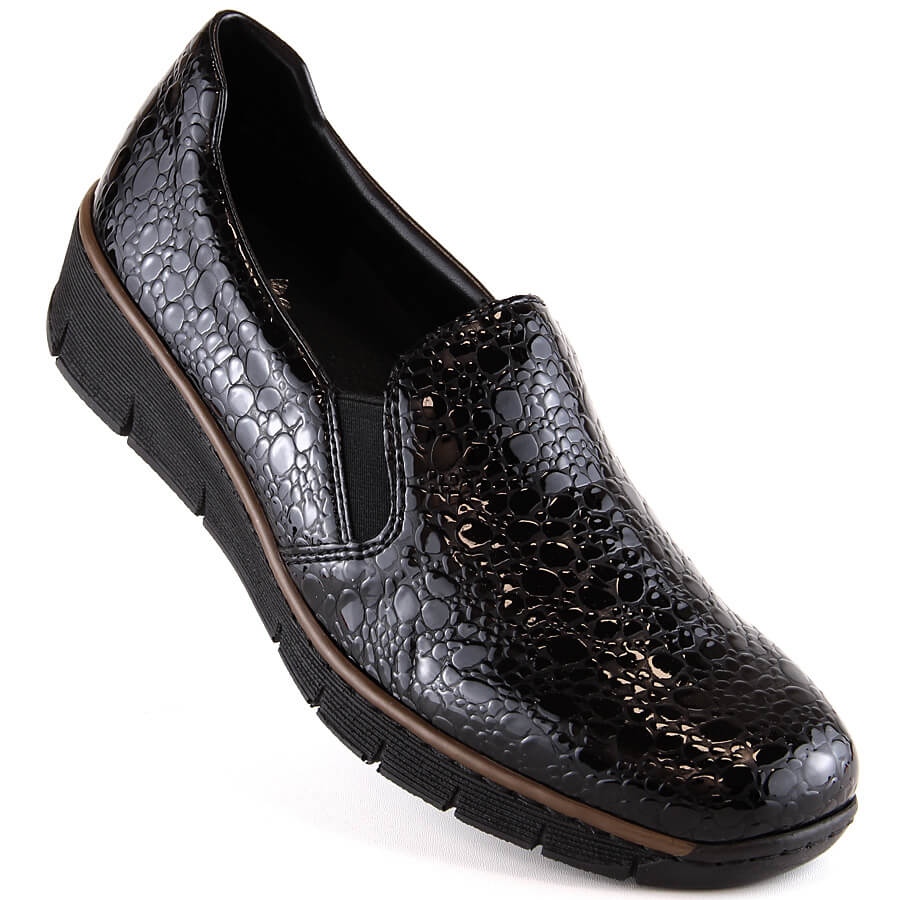 Yksityiskohdat: Mukavat lakatut naisten step-mustat kengät Rieker 53766-45