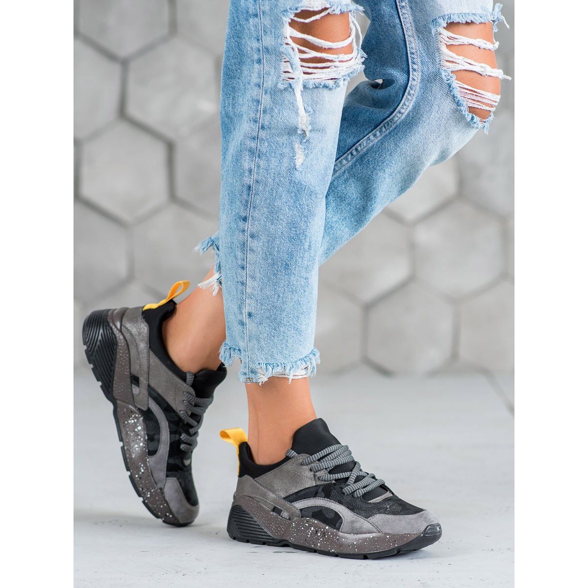 Löydä mukavuuden ja tyylin uusi ulottuvuus mukavilla Muto-lenkkarilla muodikkaissa camo-harmaissa. Näissä naisten urheilukengissä yhdistyvät toimivuus ja moderni muotoilu, jotka sopivat kaikkiin tilaisuuksiin. Harmaan sävyinen päällinen ei ole vain houkutteleva, vaan sopii myös täydellisesti sotilaalliseen kuvioon, joka on lisäksi katseenvangitsija.