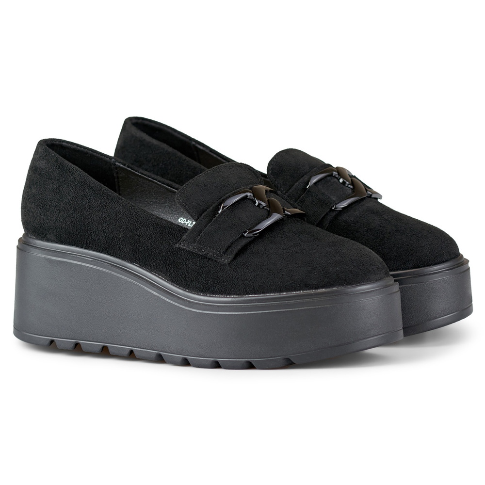 Tyylikkät naisten mustat kengät, jotka on valmistettu ekologisesta mokkasta. Malli vakaa kiilassa, jonka korkeus on 6 cm, nahkapohjalla, joka tarjoaa mukavuutta ja parempaa ilmankiertoa. Lisätty rakenne helpottaa laittamista, ja pyöristetty nenä lisää universaalin hahmon - ihanteellinen jokapäiväiseen, kaupunkien tyylityksiin.