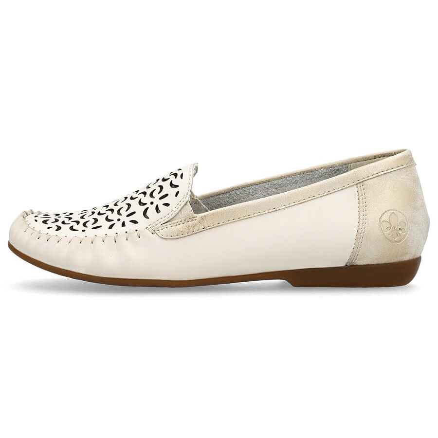 Nämä Riekerin beige-mokasiinit sopivat täydellisesti naiselliseen casual-tyyliin, mikä tekee niistä täydellisen täydennyksen sekä kesä- että kevättyyleihin. Lisäksi litteä pohja, jonka korkeus on 1,5 cm, takaa mukavuuden ja vakauden, joka on täydellinen jokapäiväiseen kävelyyn tai tapaamiseen ystävien kanssa.