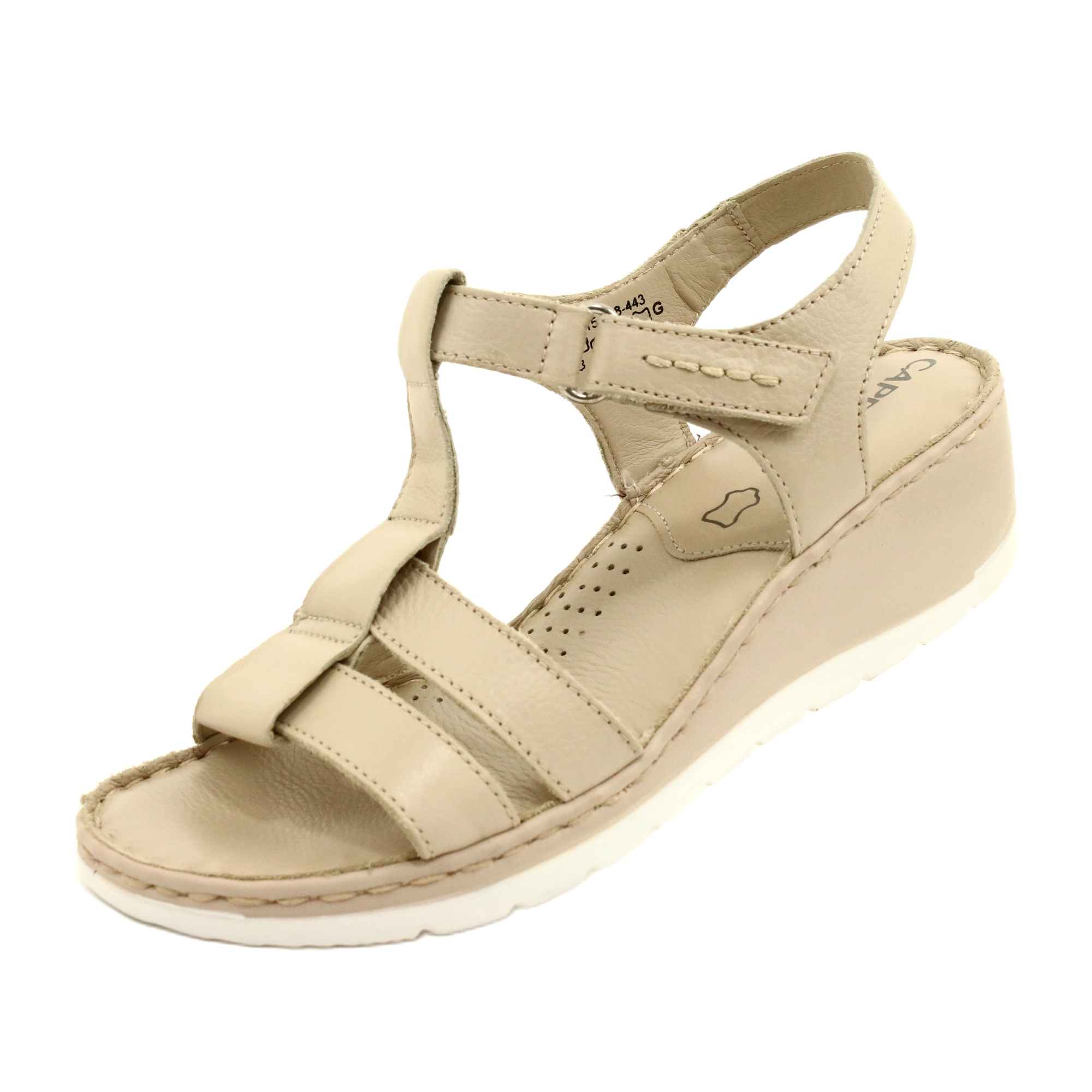 Tyylikkät ja erittäin mukavat Caprice Naisten sandaalit, jotka on valmistettu pehmeästä, luonnon nahasta klassisessa beige -sävyssä (beige). Ihanteellinen naisille, jotka arvostavat mukavuutta joka päivä-pehmeä nahkainen insertti sopeutuu jalkaan, ja kevyt, joustava lava-courn (4,5 cm korkea) varmistaa siluetin vakauden ja hienovaraisen nostamisen. Tarranauhan kiinnitys takaa nopean ja kätevän aseman ja täydellisen istuvuuden.