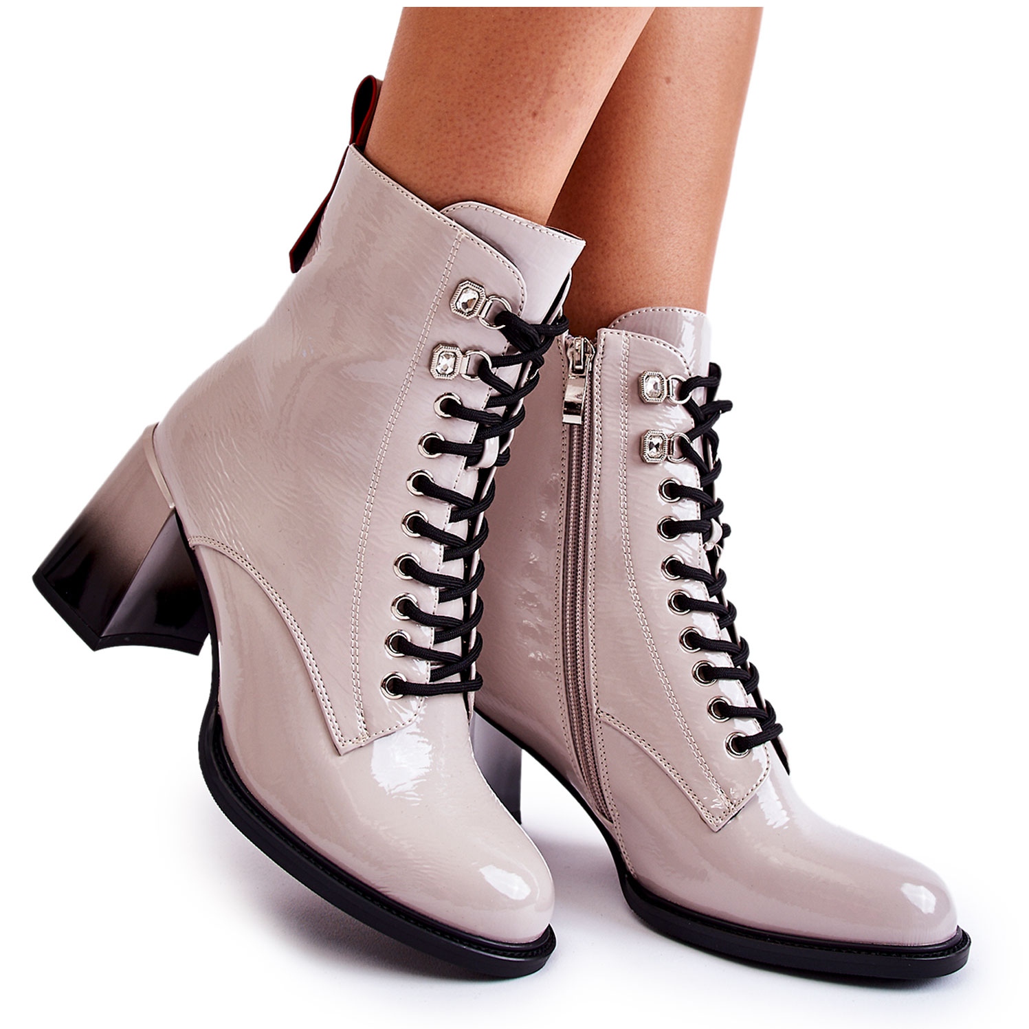 Sivusta vetoketjulla kiinnitetyt ja nauhoitettuja ne takaavat täydellisen istuvuuden jalan leveydelle, mikä mahdollistaa mukavan käytön koko päivän. Valmistettu korkealaatuisesta ekologisesta nahasta, niille on ominaista jäykistetty kantapää ja pyöristetty kärki, joka lisää naisellista viehätysvoimaa.