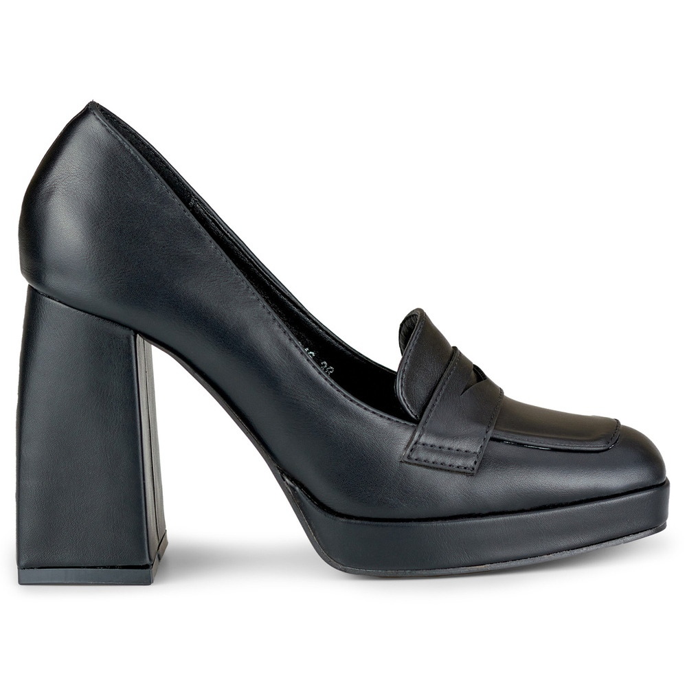 Yksityiskohdat: Muodikkaat loaferit korkeassa, leveässä tolppassa musta