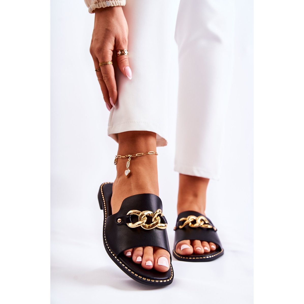 Yksityiskohdat: S.Barski Muodikkaat mustat Finess-tossut, joissa on ketju tasaisella kantapäällä