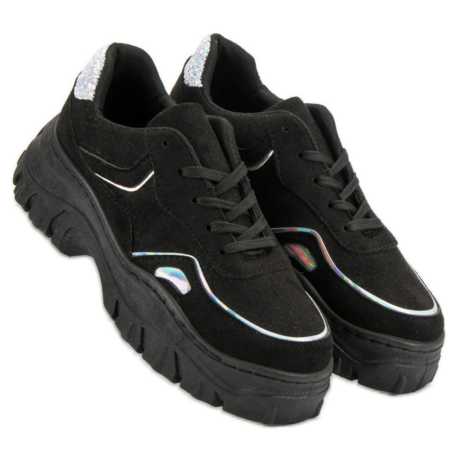 Keskikorkea, 5 senttinen alusta kirkkaan mustan värisenä vaimentaa täydellisesti iskuja ja varmistaa mukavuuden pitkien kävelylenkkien aikana. Lisäksi herkät glitterit ja kiiltävät lisäkkeet antavat niille ainutlaatuisen luonteen, mikä tekee niistä täydellisen lisäyksen mihin tahansa urheilutyyliin.