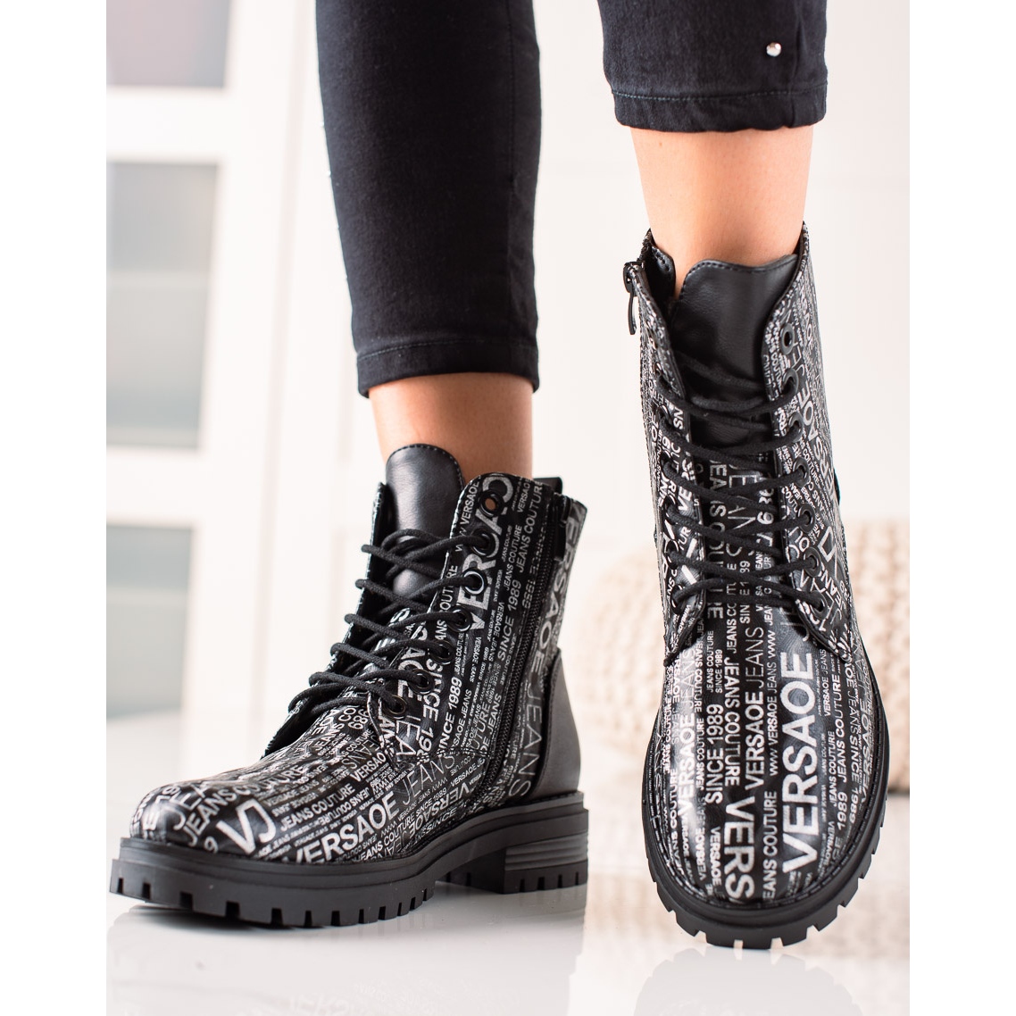Tyylikäs Goodin -työntekijät Universal Black Combine Rock -hahmoon mukavuuteen joka päivä. Ekologinen nahka, joka on koristeltu tulostetulla kirjoituksilla, antaa heille muodikkaan, kaupunkien ilmeen. Lyhyt nilkan korkeus ja pehmeä, rakennettu kantapää varmistavat vakauden, ja turkis insertti ja eristys toimivat syksy-/talvikaudella.