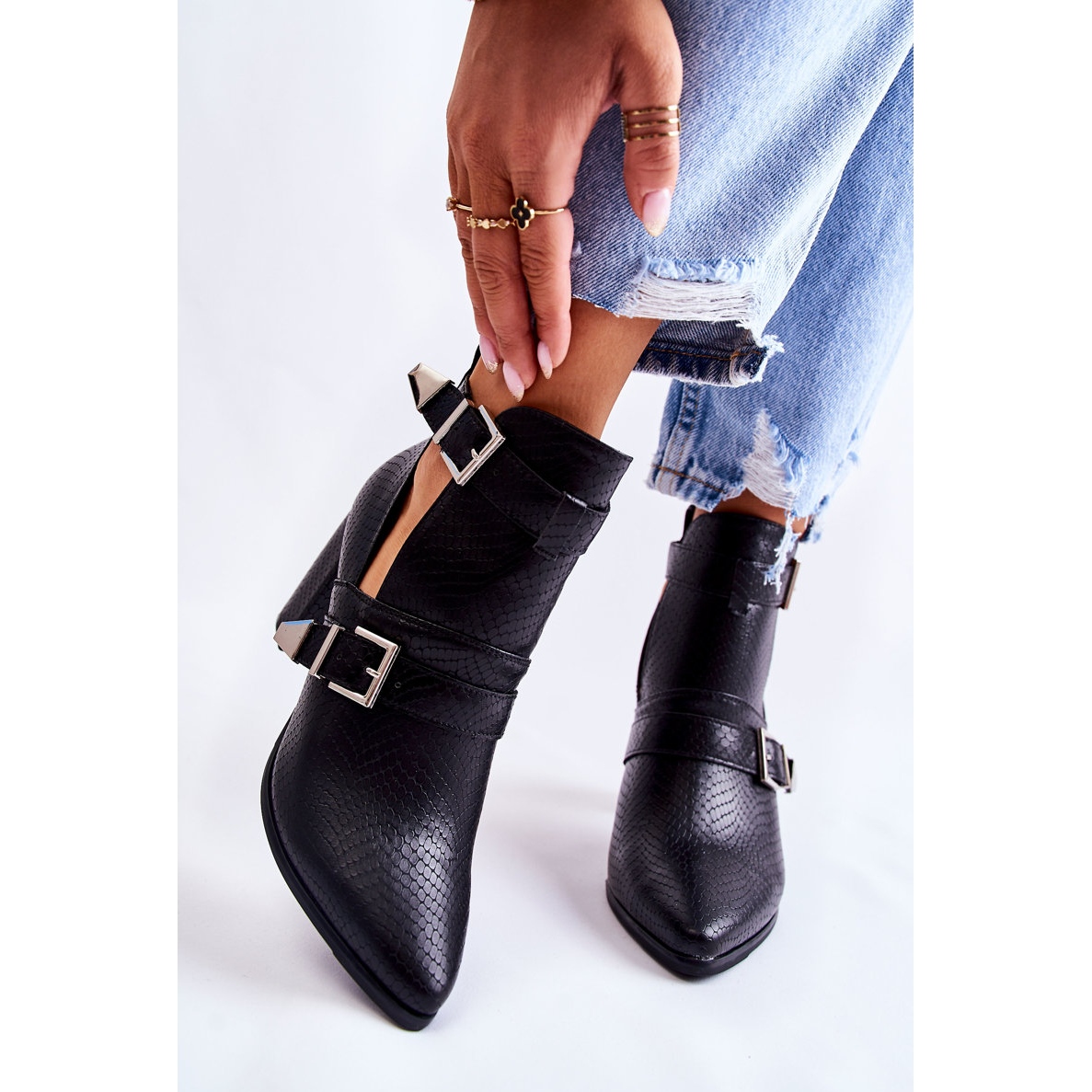 Saappaat erottuvat ilmiömäisistä sivuleikkauksista ja vaikuttavista soljeista, jotka antavat niille modernin luonteen. Lisäksi päällisen takana on käytännöllinen vetoketju, joka helpottaa kenkien pukemista ja riisumista. Terävä kärki kaventaa jalkaa optisesti, mikä tekee niistä ihanteellisen valinnan sekä arkeen että muodollisempaan muotoiluun.