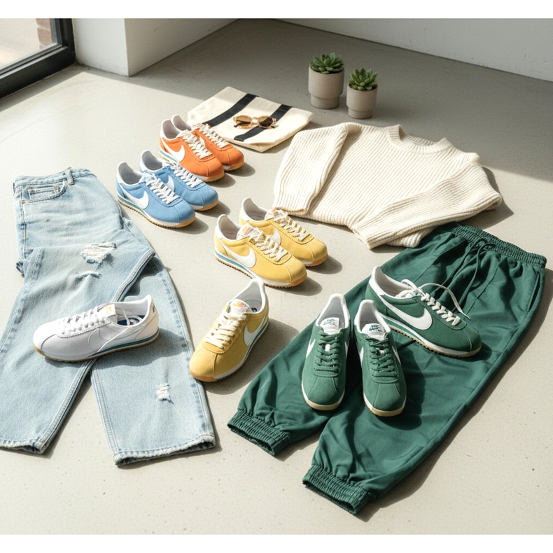Retrojuoksijat toimivat loistavasti farkkuyhdistelmän kanssa: suoralahkeiset housut ja klassinen paita tai ylisuuri neule. Kannattaa kokeilla myös yhdistelmää isojen verryttelypukujen tai leveälahkeisten housujen kanssa – kengän kapea siluetin ja leveän lahkeen kontrasti tekee ihmeitä. Uusissa kevätväreissä Nike Cortez- ja Adidas Gazelle -malleista on tullut erityisen suosittuja ja ne ilmestyvät vaikuttajien vaatekaappiin ympäri maailmaa.