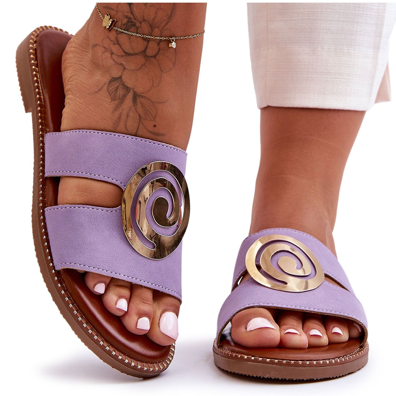Yksityiskohdat: Muodikkaat tossut, joissa on peilikoriste, violetti syvä hengitys