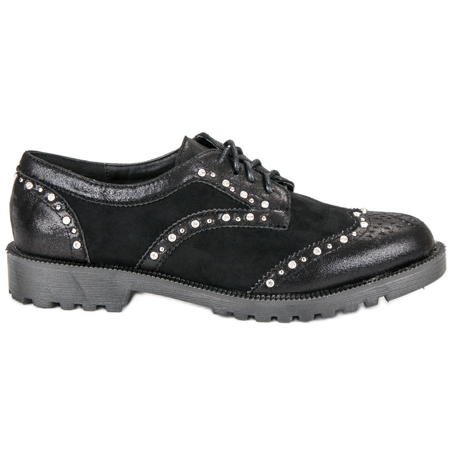 Kengissä on käytännöllinen nyöritys, jonka ansiosta ne istuvat täydellisesti jalkaan. Litteä, mukava pohja, 3 cm korkea, ei rasita selkärankaa, ja jäykistetty kantapää lisää vakautta. Lisäksi silmäänpistävät yksityiskohdat strassien muodossa herättävät huomiota ja antavat kokonaisuudelle muodikkaan luonteen, mikä saa näiden kenkien jokaisen askeleen kiinnittämään huomiota.