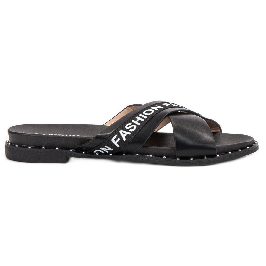 Varvastossuille on ominaista kevyt, synteettinen pohja, joka varmistaa vakauden ja käyttömukavuuden. Ylimääräisten strassikivien ansiosta nämä kengät erottuvat epätavallisella yksityiskohdalla, joka varmasti herättää huomion. Klassisen mustan värinsä ansiosta ne on helppo yhdistää erilaisiin kesäasuihin - ilmavista mekoista shortseihin.
