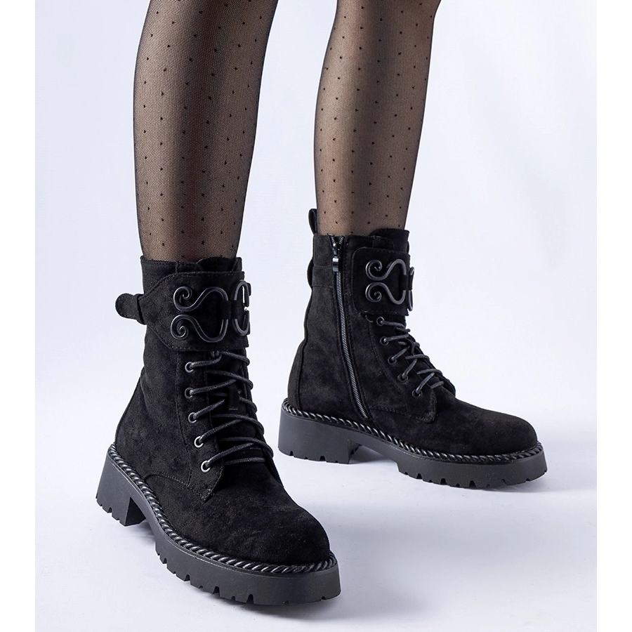 Mustat koristeelliset työntekijät Eco-Zamsz Castore-tyyliset ja toiminnalliset kengät, jotka toimivat talvikaapissa. Kosketuksen ekologisesta ihosta tehdyt iho on miellyttävä, ne yhdistävät muodikkaan ilmeen käytännön ratkaisuihin: eristys, vetoketju ja nauhoitus sopivuuden paremman säätämisen saavuttamiseksi. Kiinteä kumipohja lavalla varmistaa vakauden ja mukavuuden jokapäiväisen käytön aikana, ja pyöreä nenä antaa heille universaalin luonteen.
