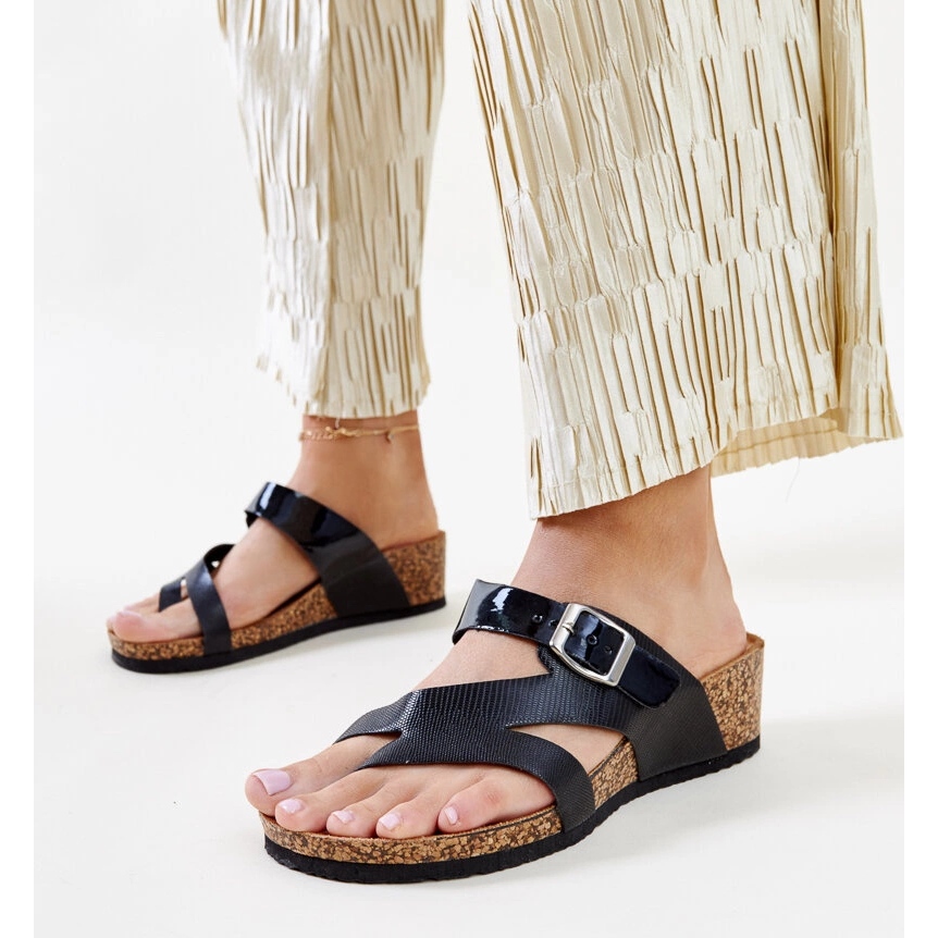 Tavanomaisen numeron ja nenän puuttumisen ansiosta Donata -kääntösuhde mukautuu täydellisesti jalkaan, ja niiden musta väri tekee niistä yhdistettynä erilaisiin asuihin. Vaahtosta valmistettu pohja tarjoaa riittävän tyynyn ja joustavuuden, mikä tekee näistä läpikulkuista loistavan valinnan pitkille kävelyille.