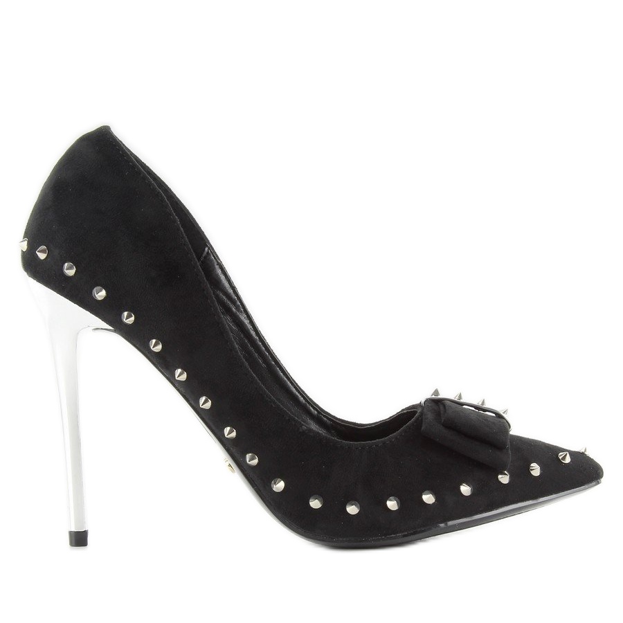 Näiden kenkien jokainen yksityiskohta on huolellisesti harkittu. Metallinen kantapään viimeistely antaa niille ainutlaatuisen luonteen, ja koristeelliset nastat ja hienovarainen rusetti varpaissa lisäävät ripauksen omaperäisyyttä ja tekevät näistä korkokengistä erottuvan muista malleista. Klassisen mustan värin ansiosta ne sopivat täydellisesti eri asujen kanssa, ja niiden mantelininen nenä korostaa eleganssia ja naisellisuutta.
