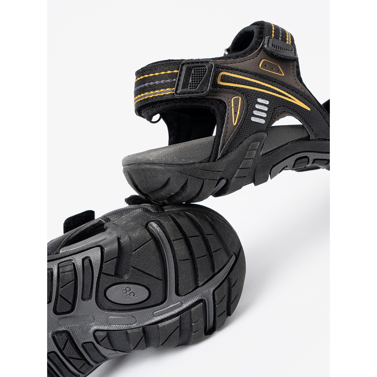 Yksityiskohdat: Shelvt Musta vaellus sandaalit, joilla on keltaiset aksentit