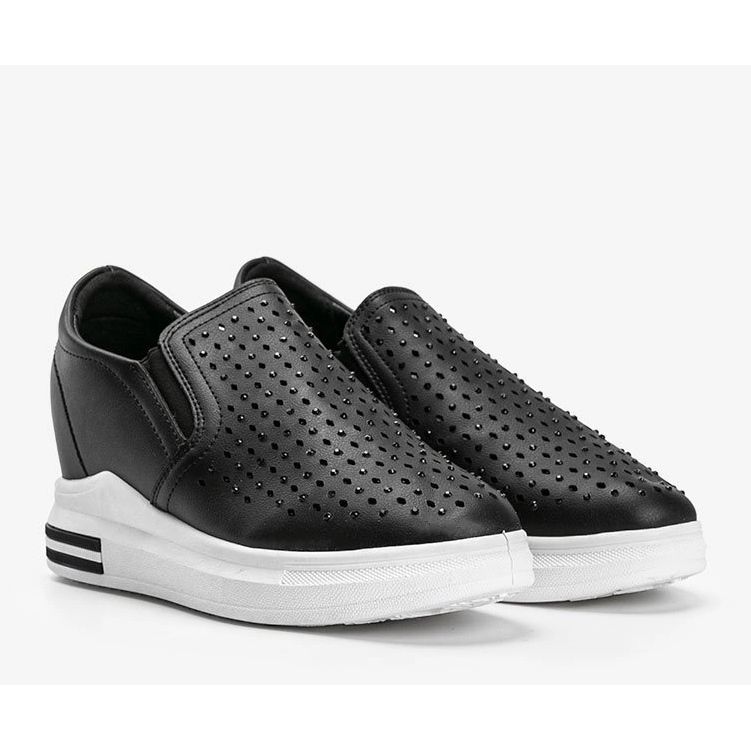 Tyylikäs, mukava ja hienovaraisesti tehokas - Slip -in -lenkkarit mustalla värillä on ehdotus naisille, jotka arvostavat mukavuutta ja tyyliä. Yläosan etuosa on koristeltu kiiltävillä zirkonilla ja herkällä avoimella kuviolla, mikä lisää kevyesti kevyet säilyttäen samalla alennettua luonnetta. Piilotettu kiila, jonka korkeus on noin. 7 cm muotoilee vaikuttavasti hahmon ja tarjoaa samalla vakaan tuen.