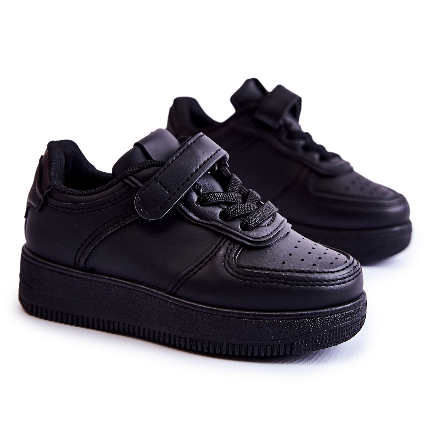 Lasten urheilukengät tarranauhoille. Klassinen, musta malli, joka on valmistettu korkealaatuisesta ekologisesta nahasta, rei'ityksen edessä, ihanteellinen lastentarhaan, ulkoilupeleihin ja päivittäisiin kävelyretkiin.