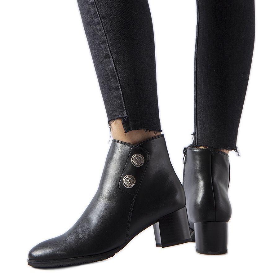 Tyylikkät, universaaliset naisten saappaat, jotka ovat ihanteellisia syksyn talvikauden aikana. Valmistettu ekologisesta nahasta klassisessa mustassa värissä, sisäpuolella, mantelin varvas ja mukava, matala posti.