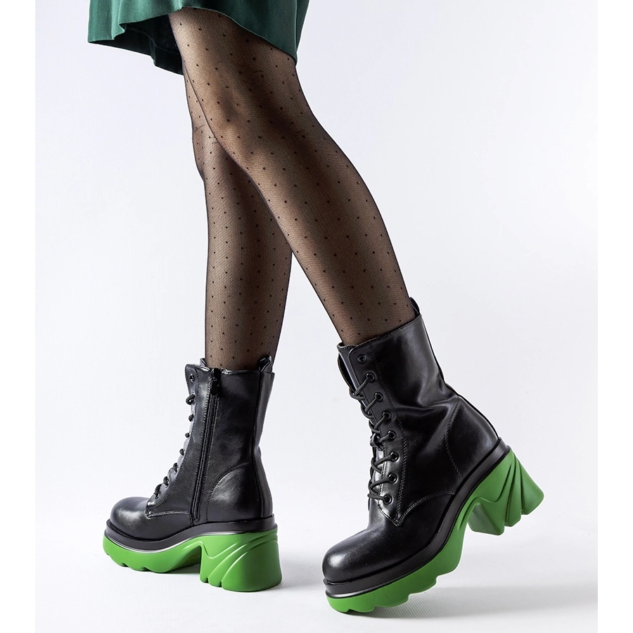 Tyylikäs ja käytännöllinen samanaikaisesti - nämä ovat syksyn talven kokoelman mustia eristettyjä saappaita. Klassinen naisten leikkaus pyöristetyllä nenällä tarjoaa mukavuutta, ja lämmitys takaa miellyttävän lämmön jopa kylminä päivinä. Pohjan tyypillinen vihreä väri lisää alkuperäisen aksentin, joka rikkoo alentuneen mustan ja korostaa jalkineiden muodin luonnetta.