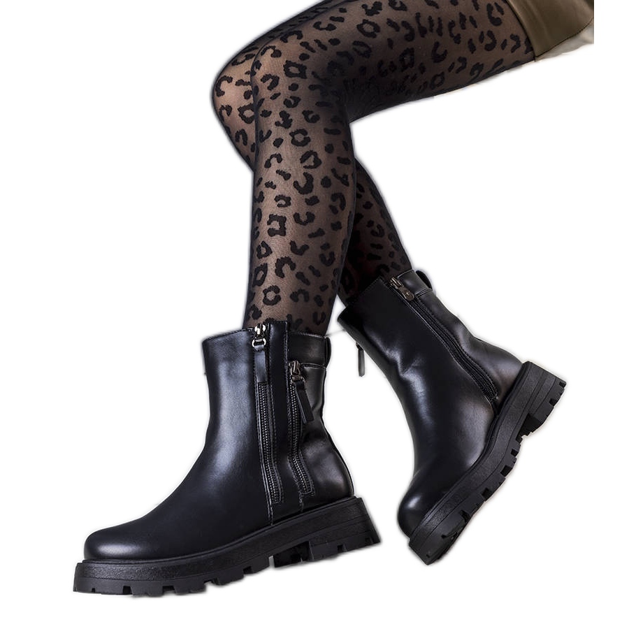 Musta lautta eristetyt saappaat - tyylikäs, lämmin ja käytännöllinen. Malli, joka sopii syksyn/talvikauden kuumimpiin suuntauksiin: massiivinen, kestävä pohja ja ajaton, musta ekologinen nahka, luo ulkoasun sekä muodikkaalta että vastustuskykyiseltä huonoille säälle. Sisustus on vuorattu pehmeällä turkilla, mikä tarjoaa mukavuutta ja miellyttävän lämpenemisen viileämpinä päivinä.