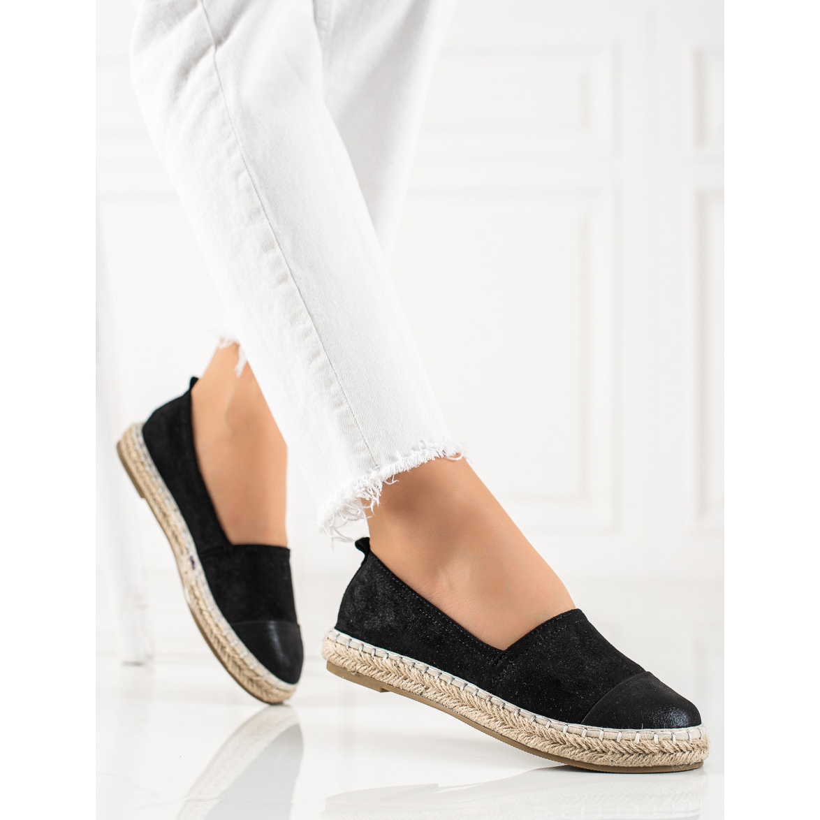 Löydä eleganssia ja mukavuutta milloin tahansa mustilla TRENDI-espadrilleilla glitterillä! Nämä ainutlaatuiset naisten kengät ovat täydellinen valinta kevääseen ja kesään, ja ne lisäävät ainutlaatuista kiiltoa mihin tahansa tyyliin. Laadukkaista materiaaleista valmistettujen espadrillien päällinen on valmistettu mokkanahasta, mikä tekee niistä sekä tyylikkäitä että miellyttäviä käyttää.