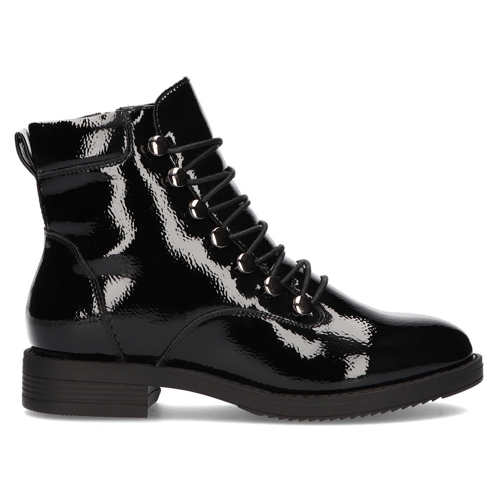 Vetoketju- ja nauhoitusyksityiskohdat ovat käytännöllisiä elementtejä, joiden avulla voit helposti mukauttaa saappaat tarpeisiisi. Lakattu viimeistely antaa niille elegantin tyylin, ja ajaton musta väri sopii sekä arki- että muodollisempiin tyyleihin.