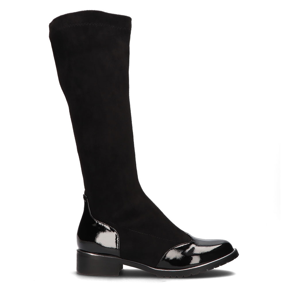 Nämä mustat saappaat sopivat täydellisesti jokapäiväiseen tyyliin. Polvet korkea ja pyöreä nenä saavat ne näyttämään klassisilta ja yleismaailmallisilta. Slip-on kiinnikkeen ansiosta niiden pukeminen ja riisuminen on nopeaa ja mukavaa. Muovipohja takaa riittävän pidon ja kestävyyden, ja 1 cm:n alustakorkeus lisää hienovaraista mukavuutta.