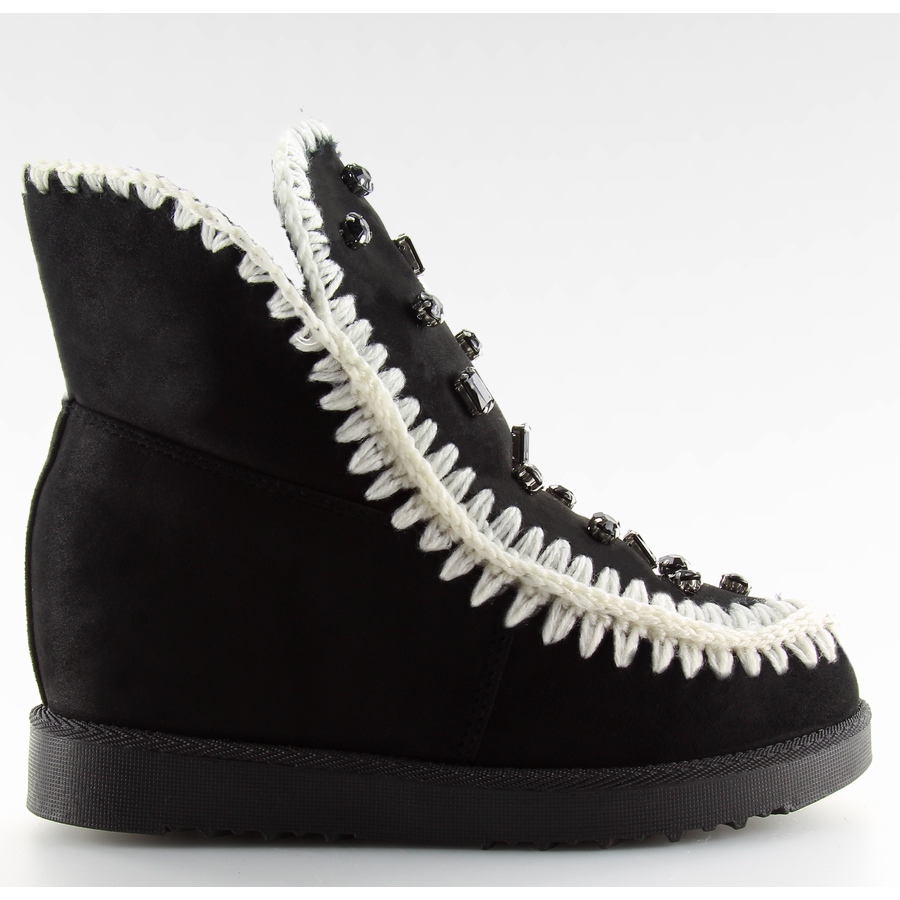 Upeat mustat naisten nilkkurit, joissa on 5,5 cm korkea kiila, jotka yhdistävät muodikkaan ilmeen arjen mukavuuteen. Etuosa on koristeltu tyylikkäillä strassilla, ja koristeellinen villaommel lisää luonnetta ja ainutlaatuista viimeistelyä. Korkea pohja eristää kylmää ja turkisvuorattu sisäpuoli takaa miellyttävän lämmön kylminä päivinä.