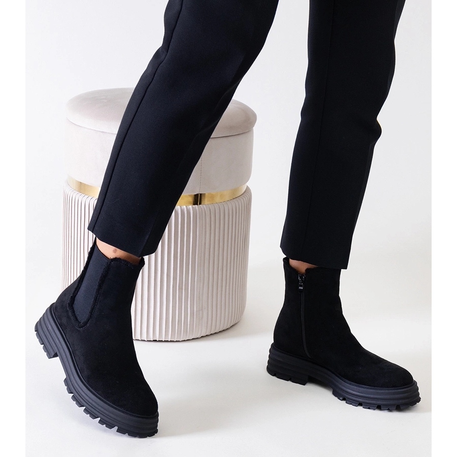 Mustat korkeat saappaat paksulla Eco-Zamsz Sabra -alustalla on ihanteellinen ehdotus naisille, jotka haluavat yhdistää tyylin mukavuuteen. Eristetty sisustus tarjoaa lämpöä kylminä päivinä, ja korkealaatuisen ekologisen nahan suorituskyky mokkanahassa antaa heille tyylikkään ilmeen.